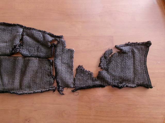 | オリヂナルのカーペットも引っ張り出してみたのですが、この部分は特に欠損が非道く、穴の部分の必要な、位置・大きさ・形の情報が得られません。 今回はベレットが手元に戻っくるのを待って、現物合わせで完全にピッタリと合わせる予定です。床の部分のカーペットも、センタートンネルカーペットを取り付けた後に、それに合わせて製作していきます。 |