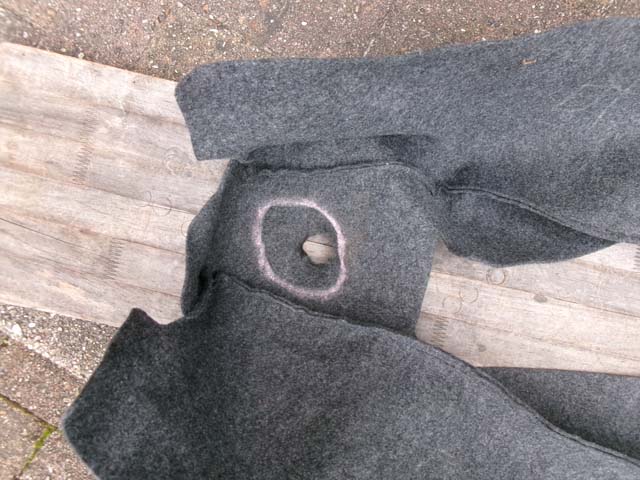 | トンネル側の穴の周りに縫製用のチョークを塗りたくり、カーペットを仮置きしてみます。 |