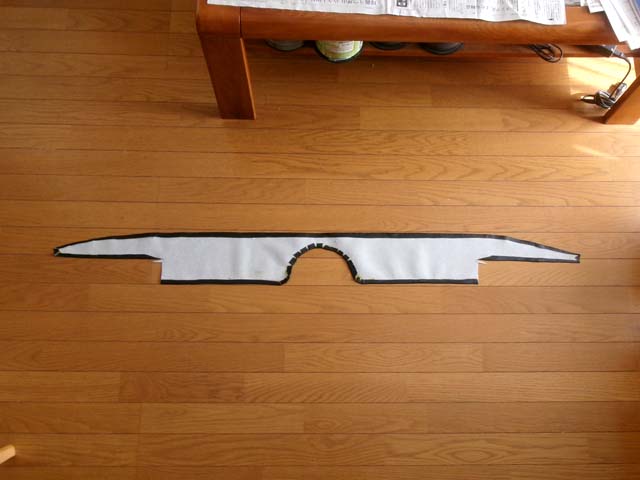 | 型紙に合わせて、ビニールレザーを切りました。 ビニールレザーとビニールレザーの接着、ビニールレザーとボディの接着ですが、前にリアトレイを作った時にビニールレザーとハードボードの接着に使った3Mのスプレーのり99が、どうも車内のリアガラスの真下の過酷な環境下では充分な耐久性を発揮できなかったようで剥がれてきております。そこで今回は接着にコニシのボンドG17を使うことにしました。 |