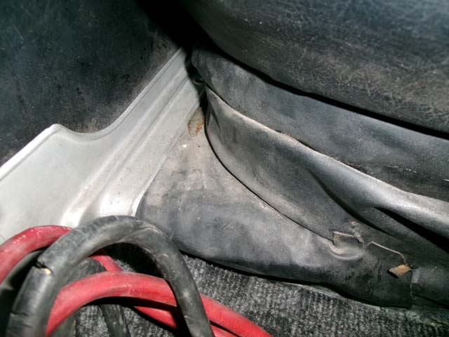 | 後席下の下の部分を切り抜き。こちらは縁を折り返して取り付けなければいけない部分が多いのですが、元のレザーを見ると上部以外は、折り返す内側に接着剤が入っていた形跡はありません。貼り付ける両面に接着剤を塗る必要のあるG17ボンド(スプレーのり99も同じですが)で、現物合わせで折り返してうまく外側だけで貼り付けできる自信がないので、折り返し部分はあらかじめ接着して縁の形を固定しておきます。 |