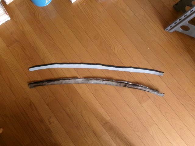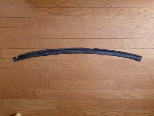 | このパーツは劣化が激しく、折り返してある部分を延ばすと割れてきて、欠けてしまいます。形からして日光のよく当たるリアガラスのすぐ下っぽいですね。全塗装の為にリアガラスを外した時に剥がれたのかな。 |