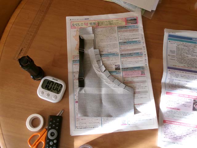 | 上側の部分を1p巾で折り返してきちんとラインを出して接着するのも、なんか難しい。作り直そうかどうしようか迷ったのですが、なんとかこれでいけるのではないかと判断しました。こういう手抜きで後々後悔することも多いのですが……。 |