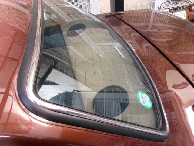 | リアガラスの下部分、ここは剥がしたビニールレザーから型を取って切り出したのですが、どうもあまり精度が出ていません。 |