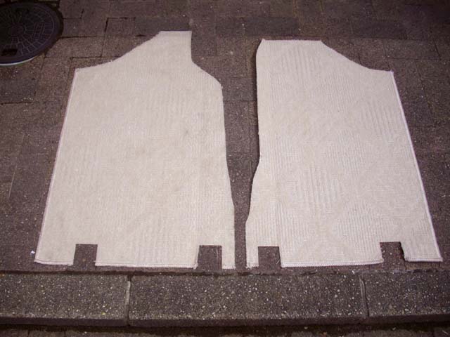 | このあたりで、作業に飽きてきたというか、面倒な仕事に嫌気がさしてきました。モチベーションが維持できません。 後部座席のフロアカーペットの形がイメージできたので、気を取り直して、2枚目のカーペットからこちらも切り出します。左右は対称なので、型は2枚で済みました。オリヂナルも多分こんな形だろう?と思います。 |