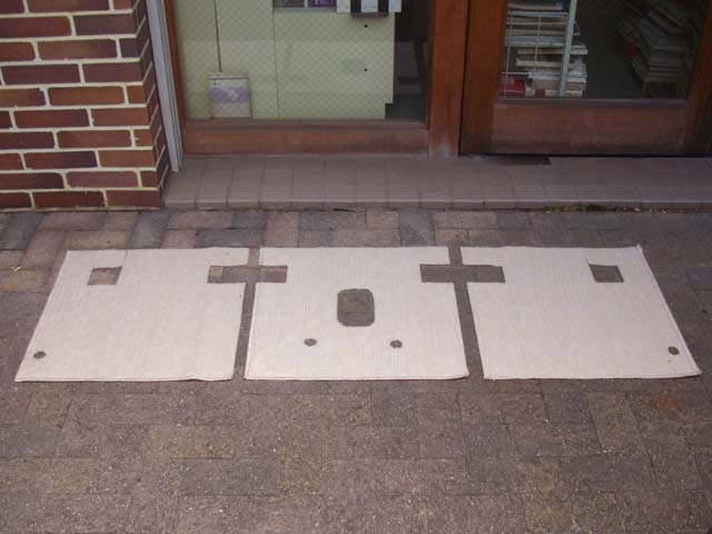 | 後は、カッターや鋏で切断した縁を、糸がほつれてこないようにかがり縫いします。この作業は、うちの奥さまにお願いするしかありません。本業の本屋の仕事でも、和本の糸の綴じ直しのような針と糸を使う作業は、「古本屋の女房」たる我が奥さまの担当です。本の普通の修理は私がやりますが、針仕事となると、全く歯が立ちません。 カーペットが薄い為、かえって縫いにくいそうです。 |