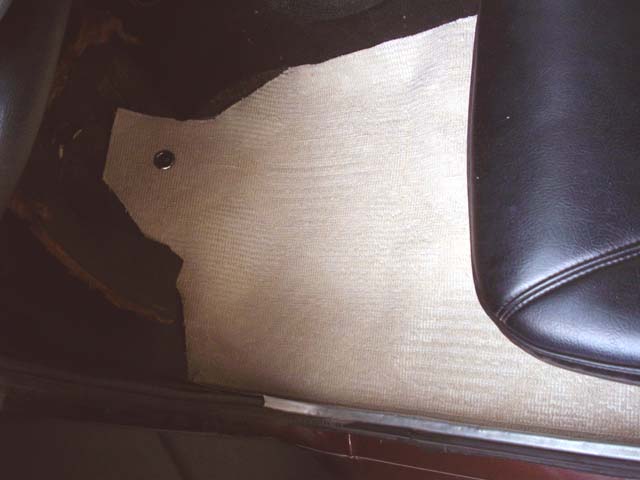 | 残るは、フロントのセンター部分ですが、完全にやる気がなくなってきたので、切り出しの作業は、ここで、ひとまず中断です。 運転席と助手席のフロア・カーペットに、ズレの防止用の32号の真鍮のハトメを打ちます。多分オリヂナルもハトメが打ってあると思いますが、内径18mmのハトメは工芸ではあまり使わないので、ホームセンターにも置いてないし高いです。 |