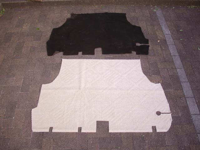 | トランクのフロア・カーペットと、運転席と助手席の間のセンター部分は、オリヂナルのカーペットが残っています。トランクは、そのカーペットで型を取ればいいと考えていたのですが、新しく製作したフロア・ボードの上に広げてみると、ヨレヨレなだけではなくて、かなり縮んでおり(流石化繊です!)、型として全く使い物になりません。 私にはカーテン屋をしている従兄弟がいます。一度その仕事を見たことがあるのですが、現物合わせで、自由自在にカーペットを切っていきます。私にそんな職人技は無理なので、まず紙でトランクの型を取ります。紙は屋根裏部屋から探してきたポスターや、チラシを使いました。 |
