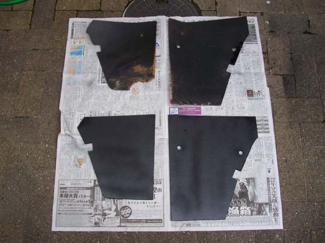 | フロア・カーペットを作っていたら、内装の傷みが気になってきました。取りあえずトランクボードを作ったときの残りのハードボードと塗料で、運転席と助手席の足下のサイドボードを作り直しました。本業の合間に簡単にできる仕事ですので、大したことはありません。 |