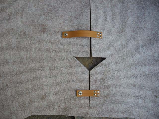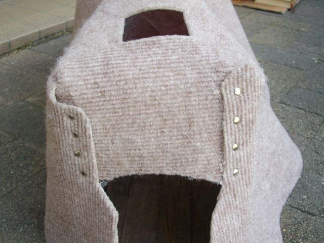 | 左右に分かれた部分を連結するバンドは、オリヂナルはビニールレザーを使ってありますが、百円ショップで買った合皮バンドを使いました。バンドをカーペットに縫合してある部分は、オリヂナルよりも内側で径7mm、足7mm長のカシメ4本で留めました。ホックの部分は、オリヂナルと同じくメス頭径15mmのジャバーホックを使用しました。 |