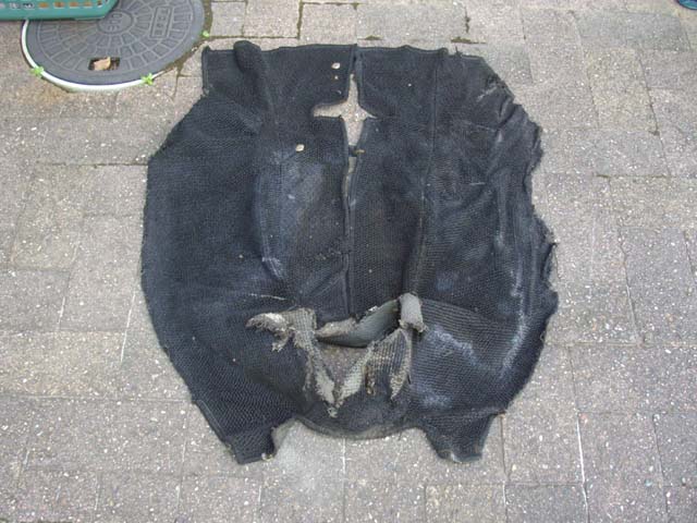 | 運転席と助手席の間のフロアカーペットを、取り外しました。一枚のカーペットで作ってあると(何となく)思っていたのですが、右側、センター部分、左側の三枚のパーツを一枚に縫製してあります。新しく作り直すのに使ったカーペットの厚みでは、このような縫製はできそうにありません。 |