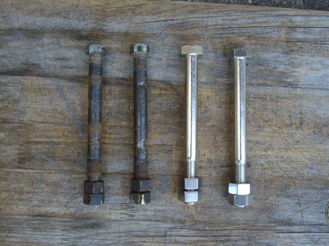 | ボルトはインターネットの小口販売で、M12×130のステンレスの半ネジを購入しました。頭とナットはオリヂナルより2mm大きく、長さは3mm長くなります。ネジのピッチは、細かいほど緩みにくくなると思いますが、特に考えて(面倒なので測って)はおりません。SUS304というと確か、堅いだけではなくて、使っているうちに糸を引くほど粘っこい材質だったと思いますので、強度は問題ないものと思われます。金属の電位差による皿の錆の発生については、よく判らないので、使いながら様子を見ることになります。 |