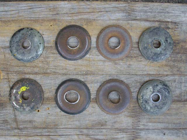ついでに、皿も灯油に浸けてブラシで磨き、油と埃の固まった汚れを落としておきました。二番目と三番目の皿のセンターの穴が、偏摩耗して拡がっているのがよく判ります。代わりの部品はないので、このまま再使用します。 |