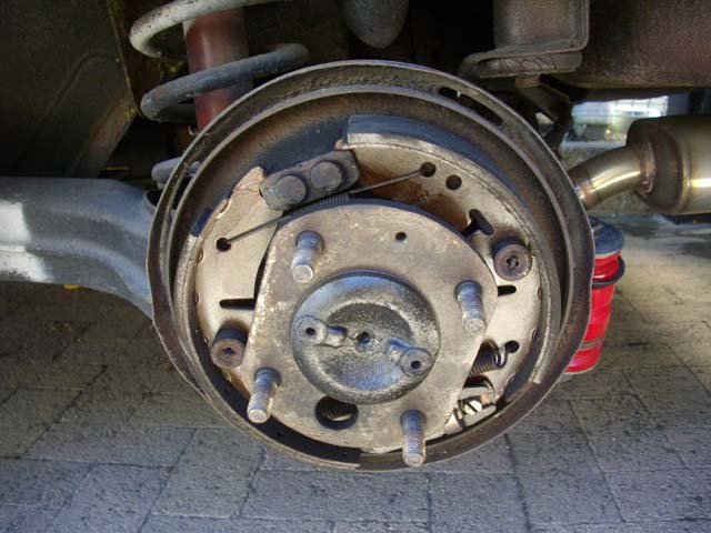 | マスターシリンダーの片側のリザーブタンクのブレーキオイルの量がかなり減っている為、多分リアのブレーキシューの摩耗によるものだろうと考えて、取り外しの作業を始めました。 リアのアルフィンドラムは、螺子一本で固定されているだけのようです。サイドブレーキを引いておいて、プラスドライバーで緩めようとしたのですが、固いです。無理をすると間違いなく螺子の頭を潰しますので、インパクトドライバーに切り替えます。ドライバーを金槌で叩くと、柄を握っている左手に回っているような感覚はあるのですが、緩みません。どうも柄が手の中で滑っているようですので、滑り防止に100円ショップで台所用のゴム手袋を買ってきて左手に嵌めたところ、やっと緩めることができました。 |