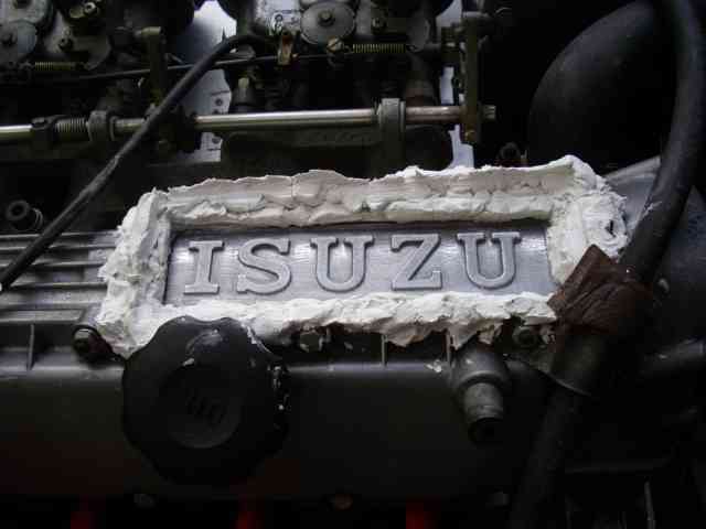 | 半乾きの状態の時に、スクレイパーで、文字部分の塗料を、できる限り削り取ります。硬化してから、オイルストーンで、文字の表面を磨いて、いすゞカラーのエンジンの完成?です。塗装面はツルツルではなく凸凹として(「全くちぢれていない」と書いたが、微妙にちぢれている?)いて、そう悪くないような気がしますが、やっぱりイマイチかなぁ。 光を乱反射して、もっとキラキラと輝く感じが欲しいですね。 予備のヘッドカバーで、再挑戦してみたいのですが、この大きさのものがはいるきちんとした箱を作ったりと、準備に時間がかかりそうです。できたらもう少し小さいパーツで実験を重ねたいとエンジンルームを見ているのですが、結晶塗装の似合いそうな、適当なパーツが見あたりません。 ※追伸: だいたい問題点も分かってきたので、多分次はうまくいくのではないかと期待しています(考 え直してみると、失敗して当然)。温度管理用の金属の箱は、加工し易いアルミ板などで作ると 材料費がかなり高くなりそうなので、どっかに使えそうなものが落ちていないか? |