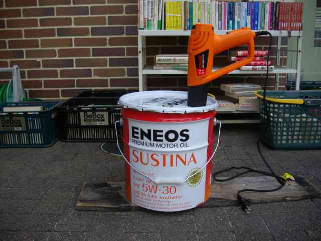 | ホームセンターで、4気筒のヘッドカバーが入る大きさで、蓋付きの安い金属容器がないか見てきたのですが、適当なものが見つかりません。ガソリンスタンドに行ったら、ゴミ箱に20Lの赤いペール缶が捨ててあったので、これを貰ってきて結晶塗装用の焼付乾燥器を作ってみることにしました。 蓋は、周りの固定部分の穴に、マイナスドライバーを差し込んで起こせば、外れます。エンジンオイルの入っていた缶なので、底にはオイルがベトぉ〜と残っていますが、新聞紙に浸み込ませて拭き取り、更にブレーキクリーナーを吹きかけて布で拭き取れば、綺麗になります。 |