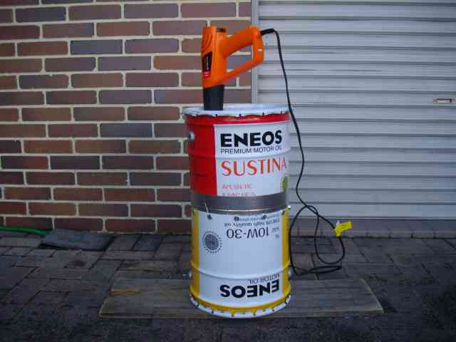 | もうひとつ缶を継ながないと長さが足りないので、底から5cmのところで輪切りにして、いらない底を取ります。ペール缶の加工については、インターネットで検索したところ、ペール缶を二個継なげて作るペール缶ストーブの作り方が出てきたので、これを参考にします。最初は金ノコの刃で切れ目を入れて、後は金切り鋏で切っていくつもりだったのですが、金ノコで切ったほうが歪みが出ずに綺麗に切れそうだったので、金ノコだけで切断しました。 蓋の注入口よりも、熱風を送り込むヒートガンの先っちょの方が太いので、ヒートガンに合わせて、注入口の金具を削りました。 ここまでで、ひとまず作業中断。 |