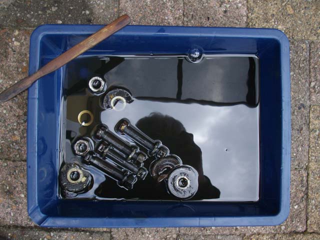 ロアアームの錆止め塗装まで、しばらく日数が空きましたが、アームのきりがつかないままブレーキに取りかかる気もおきません。今の内に、ボルトなどのアームの附属パーツを灯油に浸けて、油汚れを落としておくことにしました。