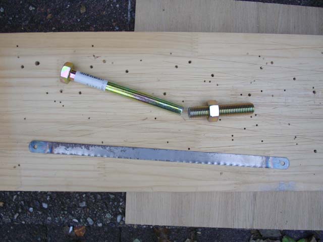 | カラーの内側(φ11.9mm)を一皮削る為に、螺子を切ってない部分が10.5mmの六角ボルトを買ってきました。六角ボルトも螺子の部分がかなり太いようでカラーに挿入できません。螺子の切ってある部分はいらないので、切り取ります。金鋸の刃で切れ目を入れておいて、ディスクサンダーでぶった切る予定だったのですが、切断砥石が見つからなかったので、金鋸の刃で最後まで切ってしまいました。 このボルトに100番のサンドペーパーを巻き付けて、現物合わせでカラーの内側を削っていきます。 |
