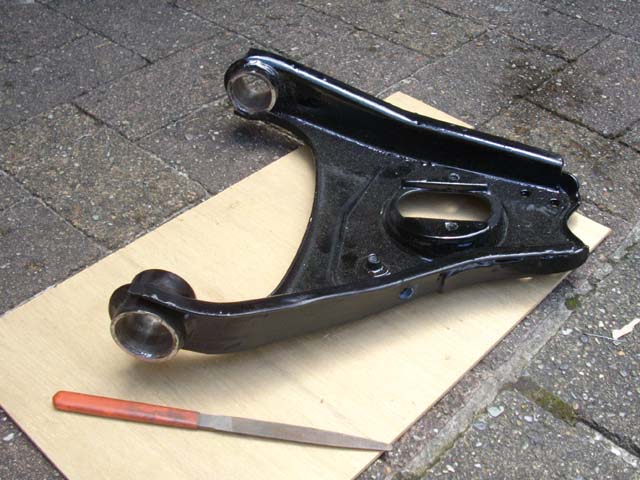| たかが0.1mm、されど0.1mm。心配していても仕様がないので、ブッシュを取り付ける為の加工にかかります。ブッシュのツバが切れないように、アームのブッシュの挿入口の余分な塗料を取っておきます。金槌で叩いても大丈夫という話もあるPOR-15ですが、削るのは簡単です。 |
