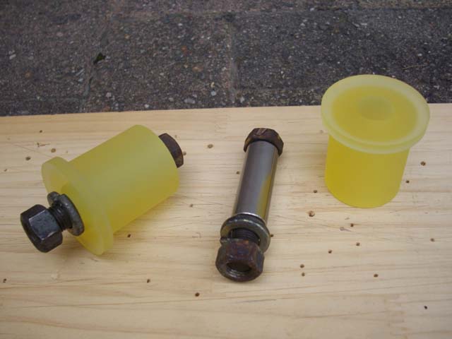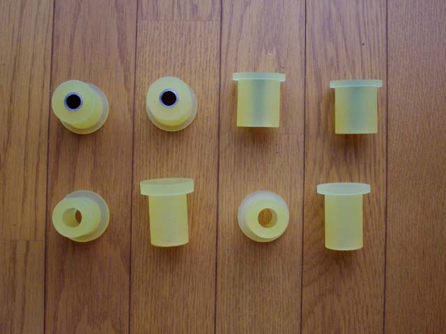 | 有限会社ブレストさんに注文してあったフロント足廻りのブッシュが出来上がってきました。注文精度はバッチシでています(これだけの精度がだせれば、0.1mm単位の加工も可能なような気がするのですが)。 問題は内径と芯径ですが、内径は全く問題ありません。芯径はクリアランス0のロアの方も簡単に挿入できます。15.9mmから16mmへの変更で、0.1mmのクリアランス(実測)のあるアッパーの方は、芯のカラーを入れてみると緩緩です。アームに挿入すれば全体的に締まるので、0.1mmくらいのクリアランスは大丈夫だと思います、多分……。問題がある場合は、カラーの方を作り直すことになります(パイプの規格に、ちょうどいいものがないんだよ)。 |