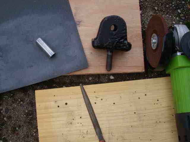 | 長めで注文してあった、アッパーアームのブッシュのカラーを、アームの取付金具内に収まるように、長さを調整します。 ちょっと長すぎた(2〜3mm)ので、ディスクサンダーに砥石を付けて、ある程度削っておいて、現物合わせの微調整は100番のサンドペーパーで削って行う作戦です。 |