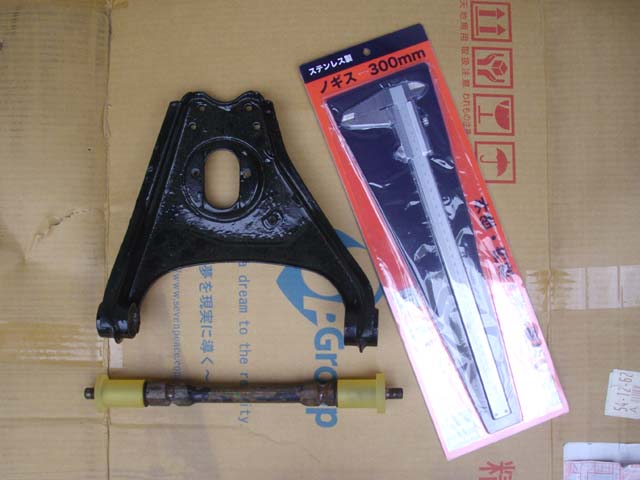 作業の手間が省けます。 左側のリアのブッシュは、ツバを除く長さが44.15mmですので、フロント側のブッシュのツバを除く長さが44.95mmになるように、ノギスで測り ながら削ります。ロアのブッシュはアッパーとは違い、ナットで押さえる式ですので、0.5mmずつ長く設定しております。 右側もだいたい同じでいいだろうと思っていたのですが、リアが44.2mm、フロントはそれに合わせると46.54mmになります。 この差のかなりの部分は、アームの筒の外側から外側の距離が、左より右の方が1.84mm長いことにより生じています。錆取りでこれ程の差がでる訳はないので、最初からこの程度の精度だったということでしょう。 あとは、アームにブッシュを挿入するだけです。 |