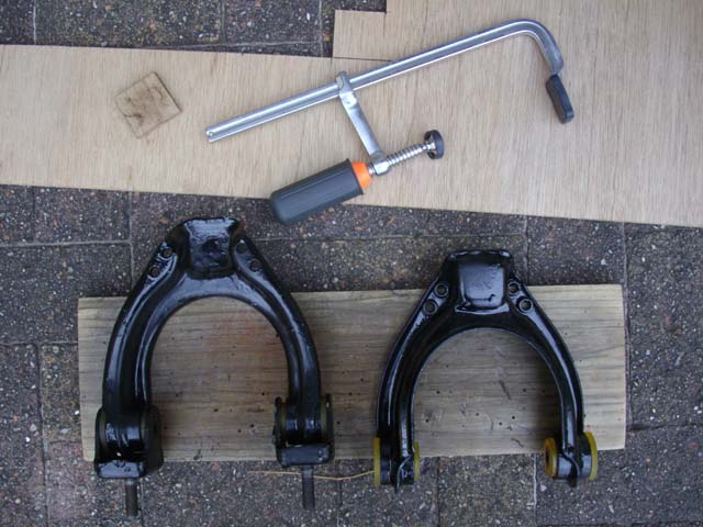 | アッパーアームにウレタンブッシュを挿入する方法については、友人のところで万力を借りればいいのではないかと思っていたのですが、インターネットで検索してみると、L型クランプを使う方法があるようですので、こちらを試してみることにしました。 |