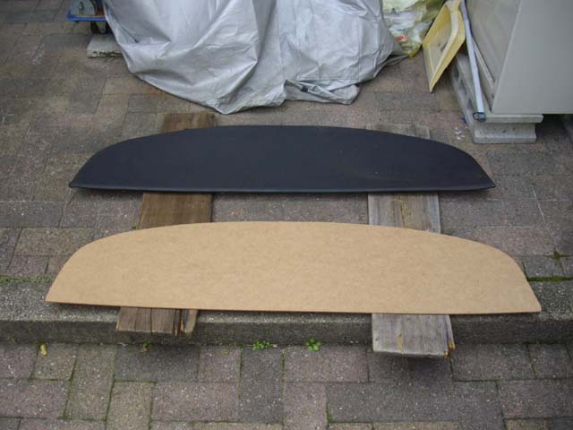 | ハードボードを二枚買って、トランクボードやトランク仕切りボード、運転席と助手席の足元のサイドボードを作り直したのですが、まだ余っていたので、リアトレイボードも作り直すことにしました。オリヂナルよりも厚い3.5mmのボードを使用しています。 オリヂナルのボードで型を取って、引廻鋸で切り抜きます。上からビニールレザーを貼る為、そう切断面の綺麗さに拘る必要はありませんので、10分くらいの作業です。角の部分は、カッターで大雑把に押し切りしてRをだし、鑢で整えます。 |