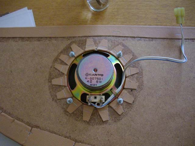 | 最後に、M4の20mmのナベネジで、スピーカーを固定します。純正のAMラジオに接続するので、こんな程度のものでしょう。 |