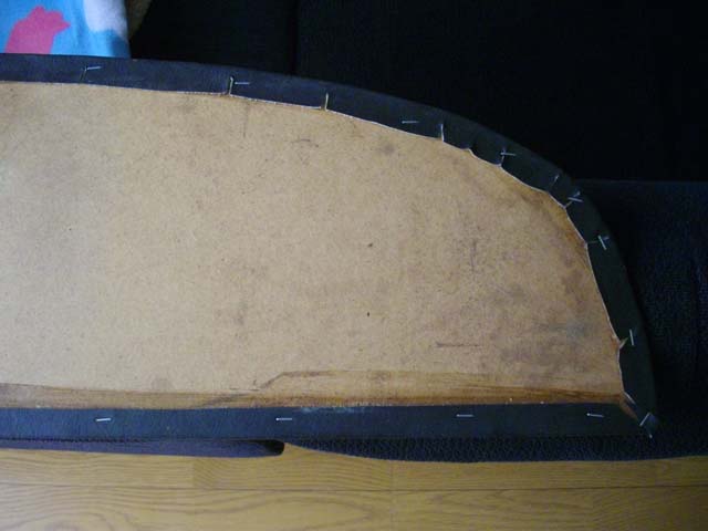 | 角の部分のビニールレザーのカットについては、奥さまの助言で大体の形を決め、現物合わせで修正していきます。折り返してボードに貼る部分は、オリヂナルよりも巾を広くとりました。 |