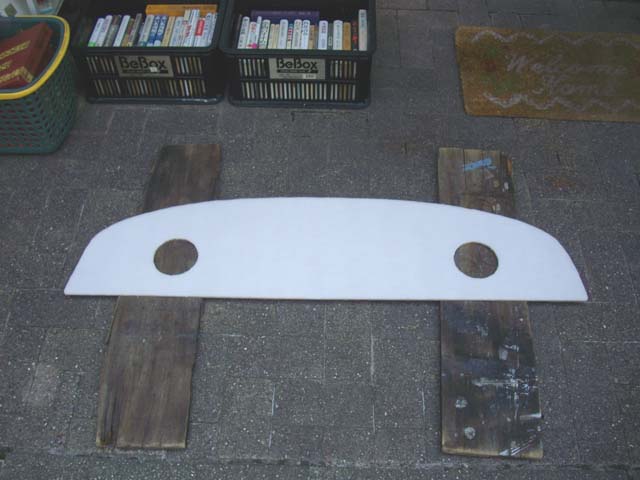 | スピーカー取り付けようの穴(オリヂナルAMラジオ+2スピーカーを考えています)を開けて、試しにベレットに置いてみます。 |