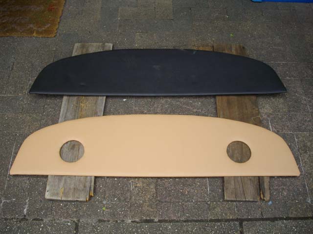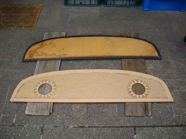 | 現物合わせの必要はなさそうです。スピーカーを付けるとなると、やはりこの程度の厚みは欲しいです。 オリヂナルのリアトレイは、まだ使用する予定でバラす訳にはいかないので、触診してみます。表のビニールレザーの下にはスポンジシートのようなものが 貼ってあります。これはスピーカーの吸音・緩衝材としても必要ですね。ビニールレザーは、裏で糊で貼りホッチキスで止めてあります。 |