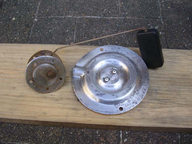 | まずは、買ったタンクの点検です。 浮き(タンクユニット)とその周りは、しっかり錆びています。やっかいなことに、浮きを固定するボルトの頭が、(腐食の所為だと思いますが)全てなくなっています。螺子を切った部分はささったままです(^^;;。パッキンは作り直さないと駄目ですね。耐ガソリン性のゴムは近くで手に入るかな?。 |