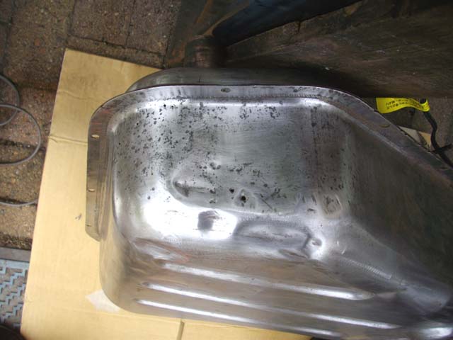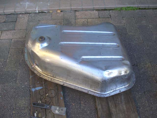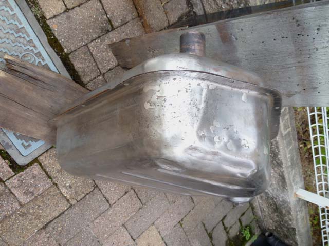 | 燃料タンクのレストア作業を再開します。 塗料剥がしを塗って、(去年剥がさなかった、錆が出ていない部分の塗料を)スクレイパーで削ぎ取ります。あとは、100円ショップで買ったディスク・ペーパーで、全体を軽く磨きます。 |