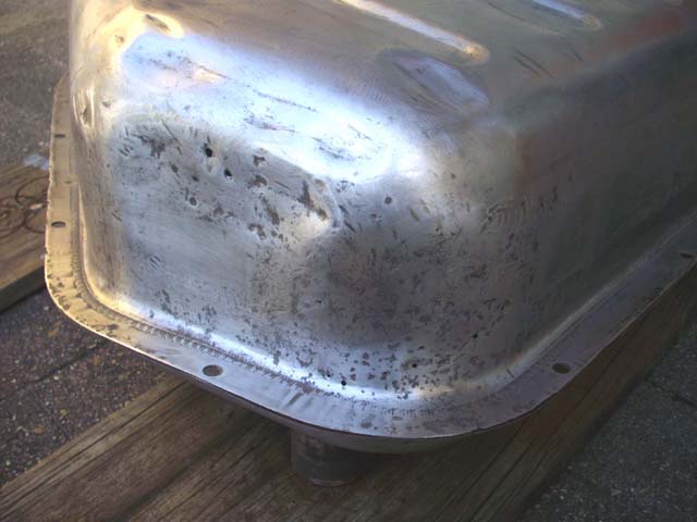 | この部分の錆が、固いだけではなくて、削ってみると意外に厚い。もうこれ以上はないだろうと思っていた貫通穴が13に増えてしまいました(爆!!)。 錆の非道かった角の部分の鉄板が、すっかり薄くなってきましたので、錆取りもこの辺りで、そろそろ限界のようです。 |