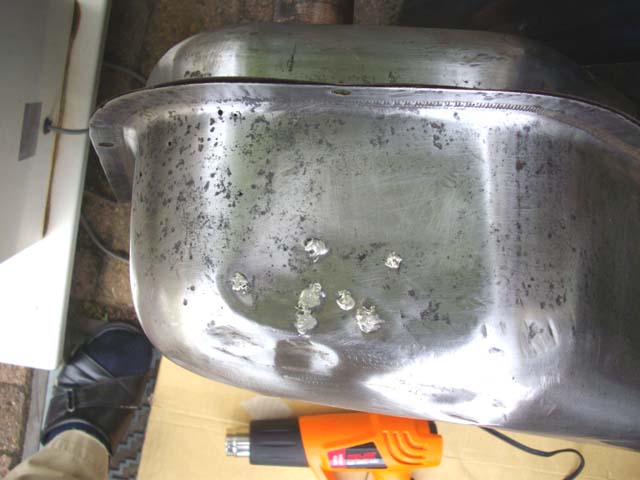 | 穴の開いている部分をアルコールを浸み込ませたテッシュで拭いて汚れを落とし、ヒートガンで加熱しておいて、まず穴の開いた部分の周りにフラックスを塗り、半田ごての先を穴に押し込むようにして、ハンダ埋めします。 このあたりは、錆を落としすぎて鉄板も薄くなっているので、穴だけではなくて、錆を落とした跡の凹部もハンダ埋めしていきます。特に鉄板が薄く痘痕状になっている部分は、表面を広くハンダで被います。 |