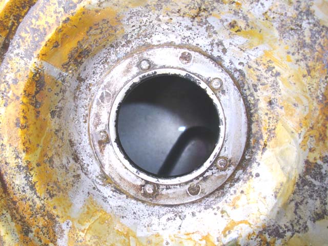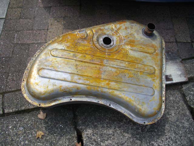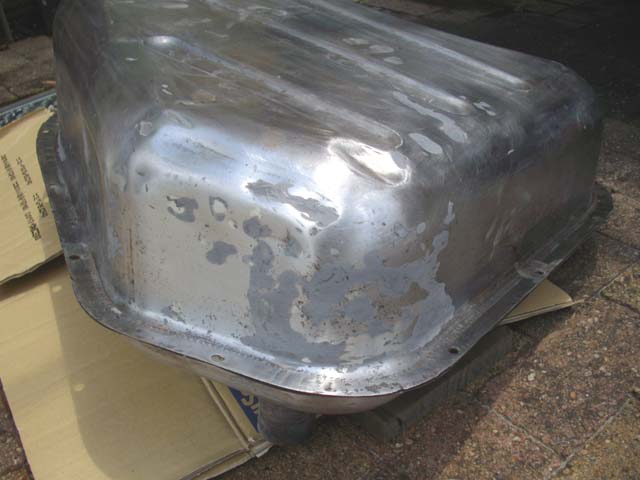 | 外から覗けるところに多少出ていた錆も、綺麗に落ちています。天日で乾かす予定だったのですが、意外に雲が多い。しかし陽が出れば、すぐに乾くでしょ う。内部はいいのですが、外側は漏れた錆取り剤で、あっという間にこの状態です。穴埋めをしたら、また軽く磨けばいいさ(本当は中和剤を廃棄せずに、タン クに塗っておいた方がよかったのかもしれません)。 |