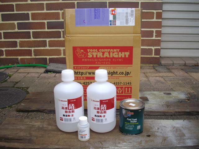 | 「今日は多分、晴れるだろう」と予想して、店を開く前に、燃料タンクの錆取りをやっておくことにしました。 以前から錆取りで使用しているRSR-2の原液を2本投入。縦にしたり、横にしたり、引っ繰り返したり、振ったりしていると、流石に塗装の養生用テープで塞いだところから、錆取り剤が少しずつ漏れてきます。それでも振り回していたら、「げぇ!」漏れてはいけない側面からも漏れている。 錆をこれでもかっ!といくらい削って、貫通穴を全て確認し、ハンダで(13〜14個は)埋めたはずなのですが、どうもひとつ(浅い痘痕程度に思って)見 落としていたようです。先日タンクの洗浄がてら確認した時はこんな漏れはなかったのですが、錆が溶けることによって完全に貫通してしまったようで、次第に 漏れがひどくなってきました(^^;;。内部のコーディングの前に見つかってよかったです。 一時間ちょっと振り回した後、錆取り剤を抜き(再使用可能な為、濾して取っておきます)、水を満水にして洗い流す作業を5〜6回繰り返した後、錆び止め 中和剤のER-G3000を400mlの水で希釈して投入。10分くらい振り回して、タンク全体に行き渡らせた後、廃棄しました。 |