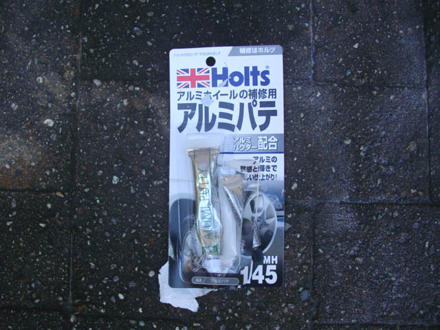 | 呉のホイールクリーナーで洗い、ガリ傷や欠けた部分は、ホルツのアルミパテを盛って誤魔化しました(^_^)。 表面の腐食は、3Mのスポンジ研磨剤スーパーファイン(#320〜#600)で削ります。 |