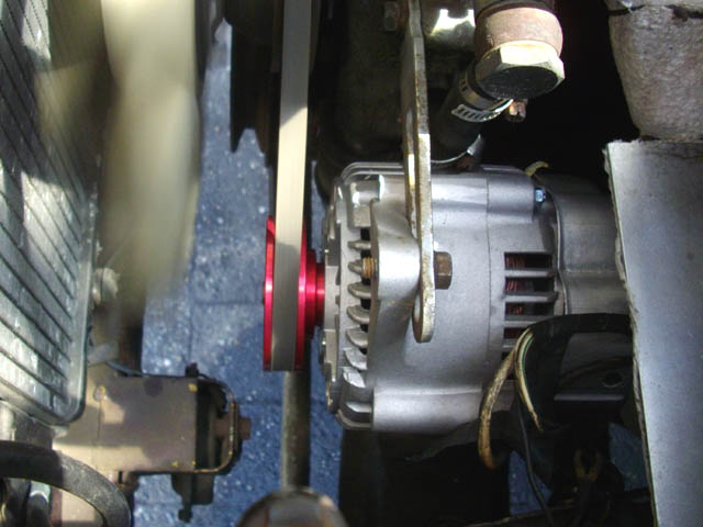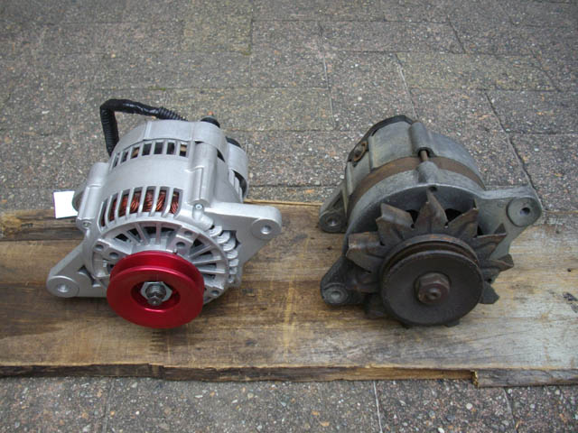 | 先月、次期のエンジン用のパーツとして、富士ファイルデバイスさん製のICオルタネーターを注文しました。その時に、現物合わせの為に純正のオルタネーターを外して、先方に送りましたので、どうせオルタネーターを外したのなら、ICオルタネーターに交換しておくことにいたしました。 オルタネーターを外す時に、バッテリーの−端子は外しておいたのですが、ちょっと訳あってバッテリーを繋いでいたところ、オルタネーターから外したB端子が知らない内に、アルミの鋳物部分に触れて、煙を出して燃えていました。げっ、恐ろしい! 外したままの状態で危険なら、B端子をさっさと新しいオルタネーターに固定して、付けるとこまでやってしまった方がいいということで、取付作業を開始しました。 |