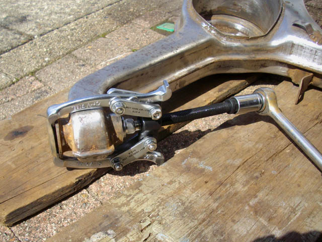 | ブッシュのカラーに六角穴付きボルトを差し込み、ボルトの穴にプーラーの螺子部分の先端ををセットします。カラーとゴムブッシュを均一に押すために、ボルトには平ワッシャーを二枚重ねで入れました。リアアームとプーラーのアーム部分との干渉はないようです。 プーラーの螺子を締めていくと、思ったより簡単にブッシュを押し出すことができました(プーラーで押すというのも、変な表現?ですが)。 |