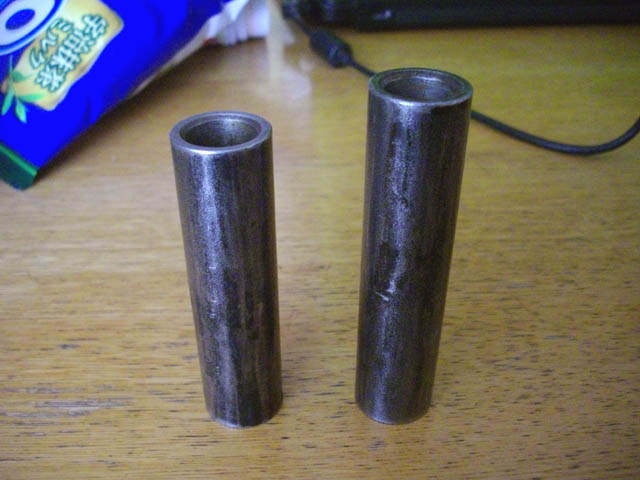 | いつもの住友3Mのスーパファインで軽く磨いた後、リスロンで更に磨きました。 ピカピカになるまで磨いてもあまり意味はないので、表面の微細な凹みに残ったゴムは気にしない事にします。 サイズを測定してみると、短い方の方のカラーは外径20mm、長さ74.8mm、長い方のカラーは外径20mm、長さ83.8mmでした。ブッシュは、僅かに長い75mmと84mmでよさそうです。 |