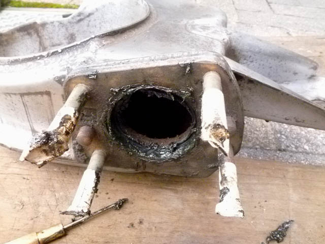 | ヤフオクで、リアアームの状態の良いものを入手したので、4月の初めから錆取り作業を始めました。 100番のサンドペーパーや金鑢を使って、ただひたすら磨きます。際限なく出てくるように思われた錆が、急に出なくなってきたら作業の完了間近です。後はペーパーで落としにくい部分の錆を、集中的に磨きます。 熔接の凸凹のある部分はペーパーでは錆が取りにくいので、ダイヤモンド鑢で擦り取り、錆の溜まっていた部分は突き刺すように、穴が開いてないかを確認しま す。ガソリンタンクを修理したとき、錆による貫通穴を1個見落としていたことを反省しての作業です。もっともアームの場合は、錆穴ではなくて、熔接で埋め 切れていない隙間ですが。 |