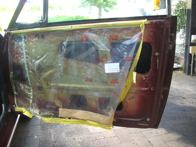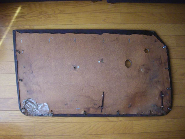 | ドア側は、やはり防水シートを留めているテープを剥がさないと作業できないようです。ドア側には一ヶ所、対応する穴(ボード側の前方の上から二つ目)が ないようです。そうすると、ひとつのドアに必要な留め金具は、全部で10個ということになります。留め金具の受けは4個なくなっていたので、これも FFD4649 さまからのいただき品で、補いました。 |