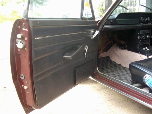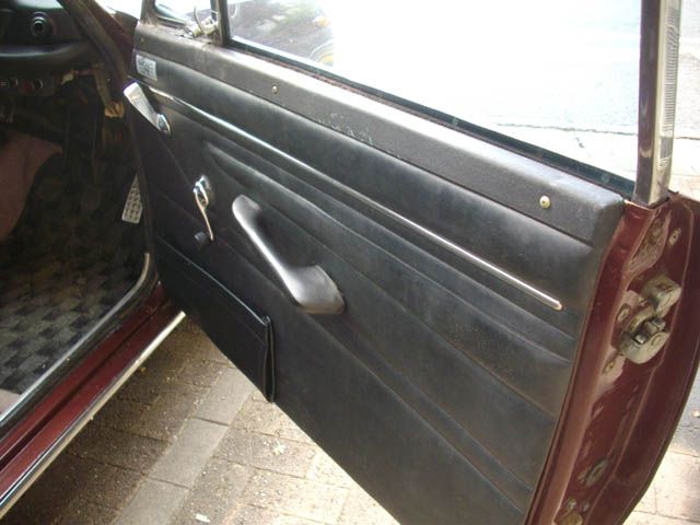 | まあまあ、いいんじゃないでしょうか。黒いゴム紐を選んだのは、正解でした。ゴム紐が目立っていけません。縫製が思うようにできなかった部分は、自分でよく判っています(^^;;。 ドアノブのストッパーは新しく作ったものを使用しました。ノブが、どんな角度で付いていたかは忘れたので、私の使い勝手で決めました。 次は助手席側です |