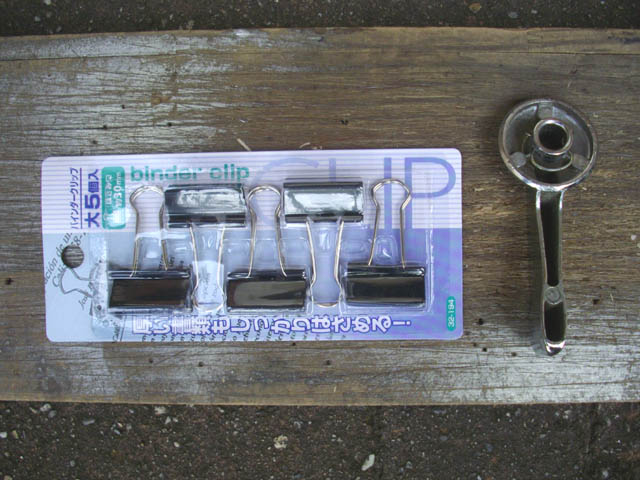 | 百円ショップで、バインダークリップの大を買ってきて、ハンドル部分を取り外します。少し小さいかと思ったのですが、外してみるとちょうど良さげなサイズですね。 |
