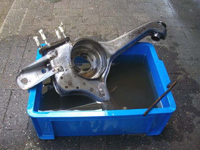 左側のアームは、懸念していた、スプリング受けの上下の継ぎ目から水が噴き出しました。この部分は、水漏れ部分が確認しづらいので、(念の為右側のアームも一緒に)ぐるっと一周J-Bウエルドで埋めといた方がよさそうです。