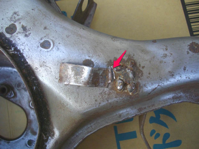 した。右は、後から付け直してあるような感じの雑な熔接でした。 仕方がないので、アームからベロの残りを削り取り、1mmの鉄板で、新しいベロを作ります。 |