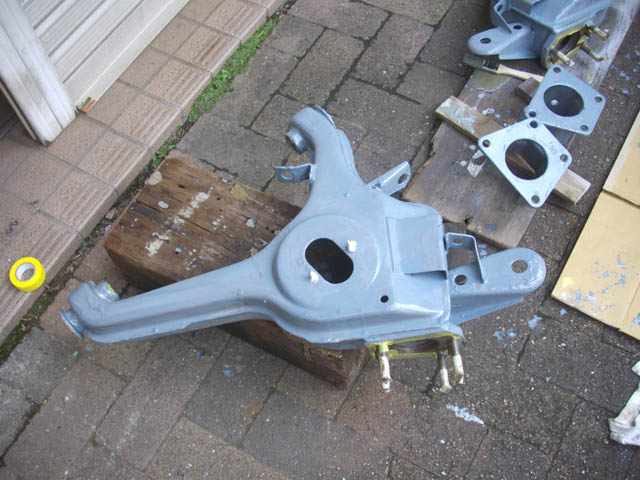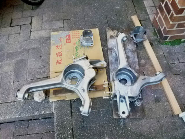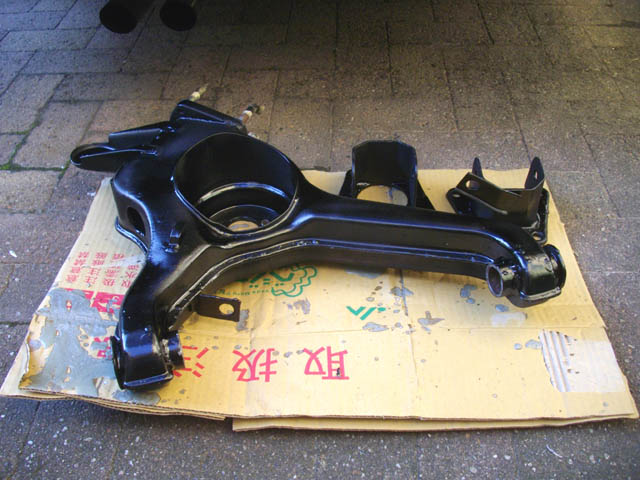 | フロントのアームと違い、吊すには重たいので、とりあえず上半分を防錆塗装します。防錆塗料は、POR-15を使用します。素人としては時間のかかる防錆塗料の評価はなかなかできませんので、単純に世間の評価の高いものを使います。刷毛は、使い捨てです。 |