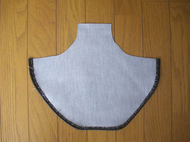 | 横の部分を5mmの縁取りで縫い合わせます。端のレザーが4重になった部分は、返し縫いの処理は無理と(奥さまが)判断して、玉結びで止めました。 縫い目を指で押して割り開き、裏返せば完成です。 |